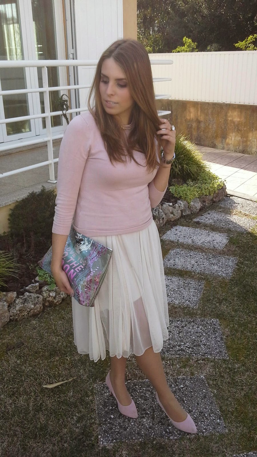 Anel Pedra: Avelina Correia Artesanato | Anel Falange: H&M | Brincos: Bijou Brigitte | Camisola: Zara | Saia: Comércio Local | Sapatos: Showroomprive | Mala: Papaya na Papelaria Inédita | Relógio Swatch